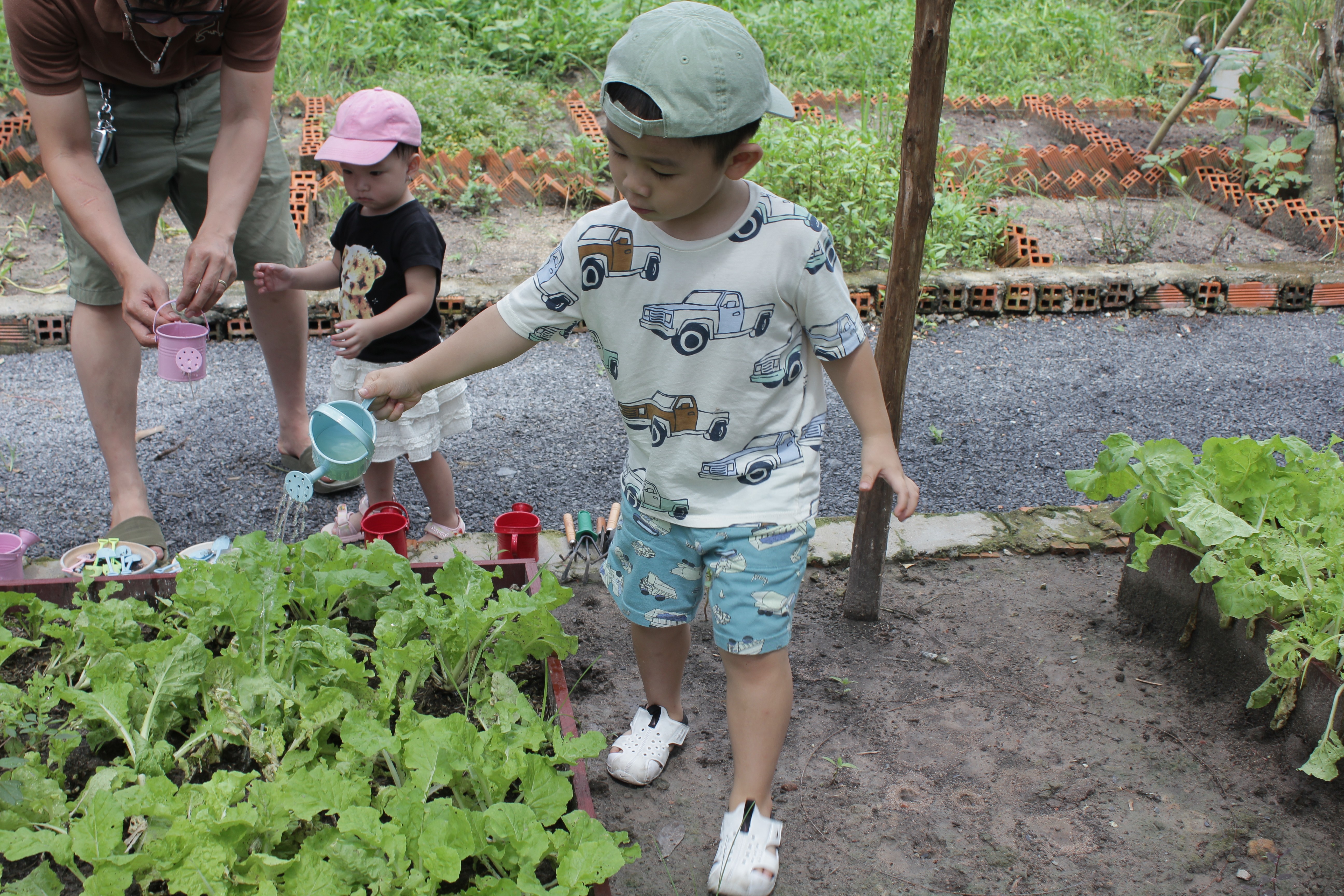 Bé khám phá và vận động ngoài trời, phát triển thể chất và trí tuệ giữa khung cảnh xanh mát.