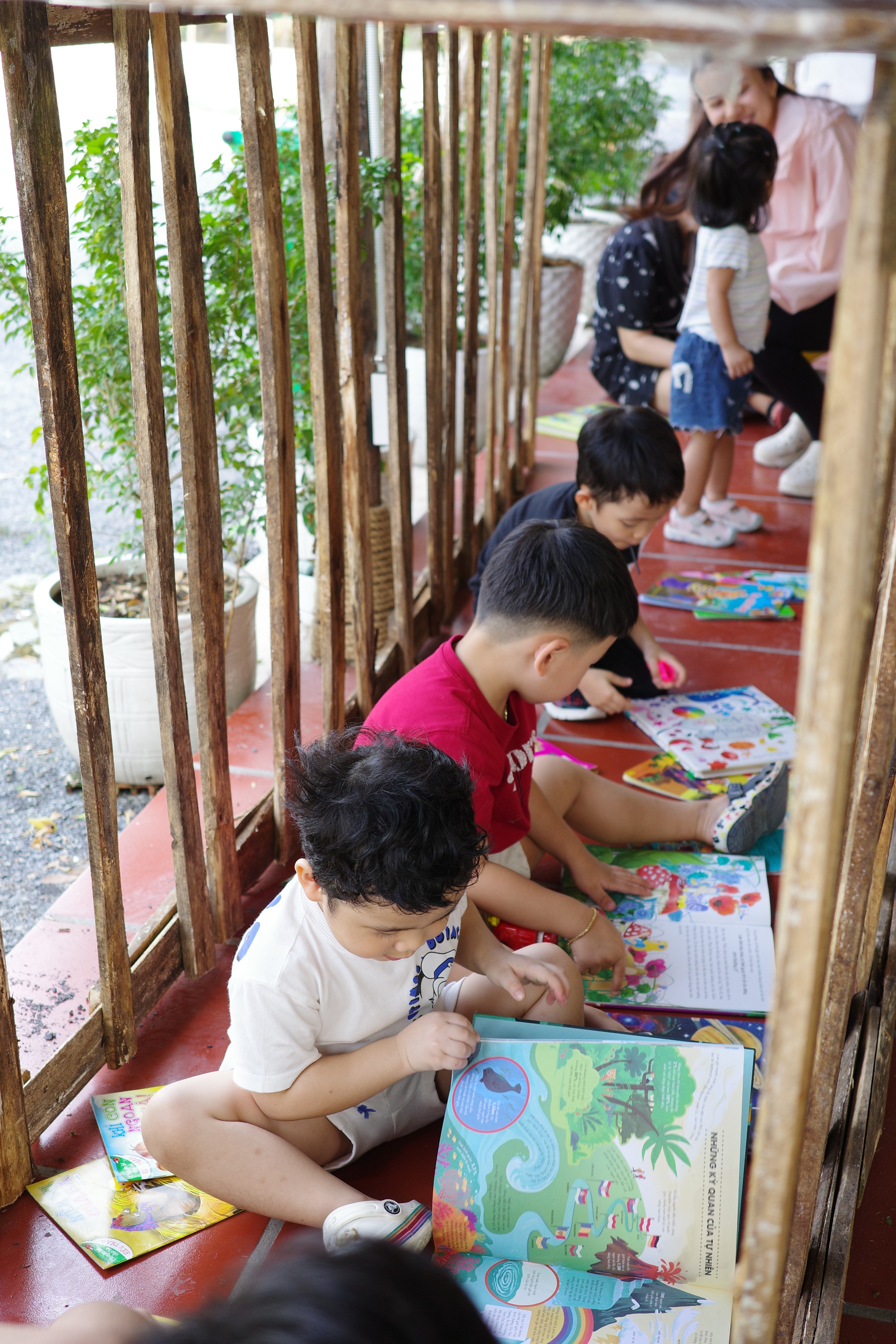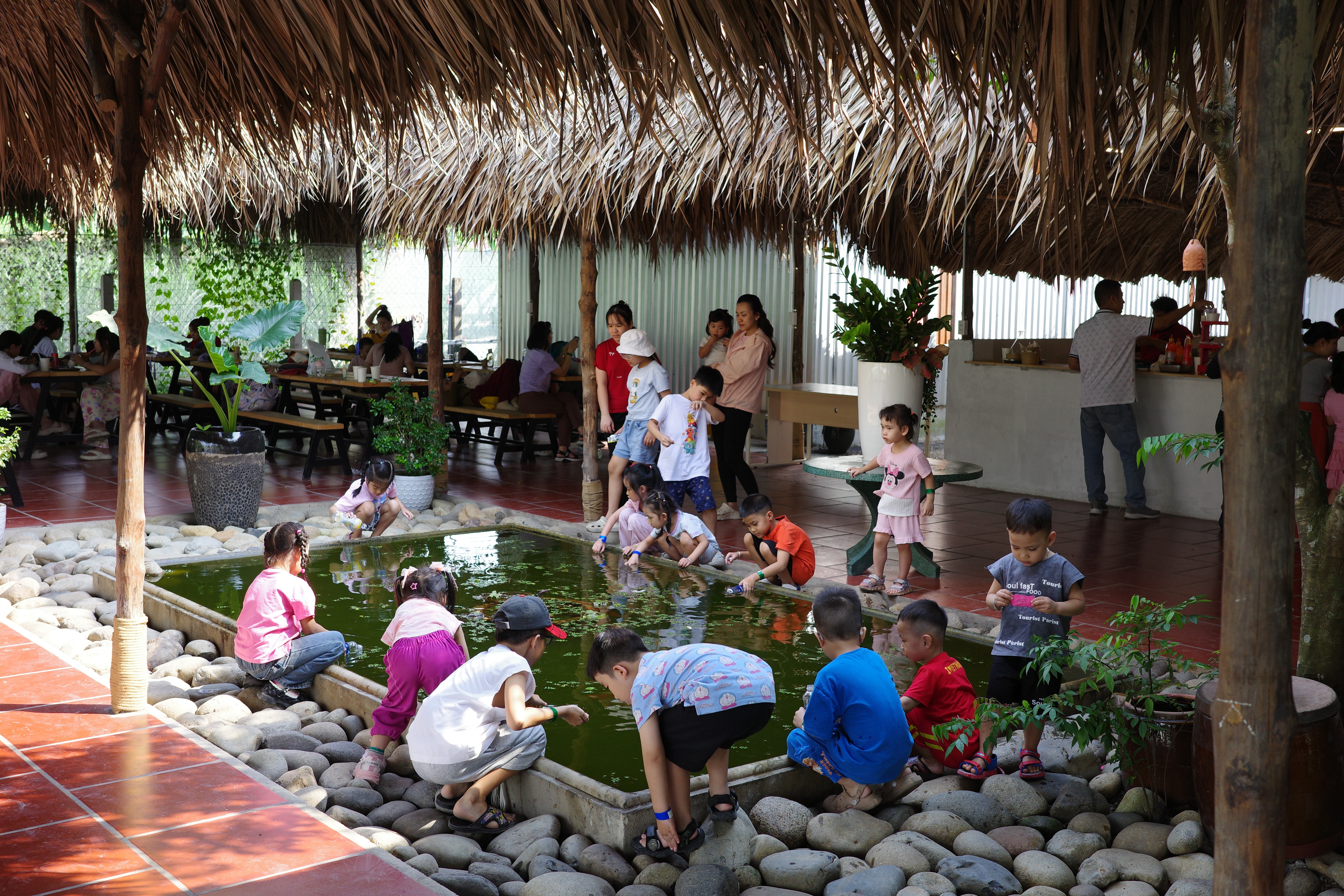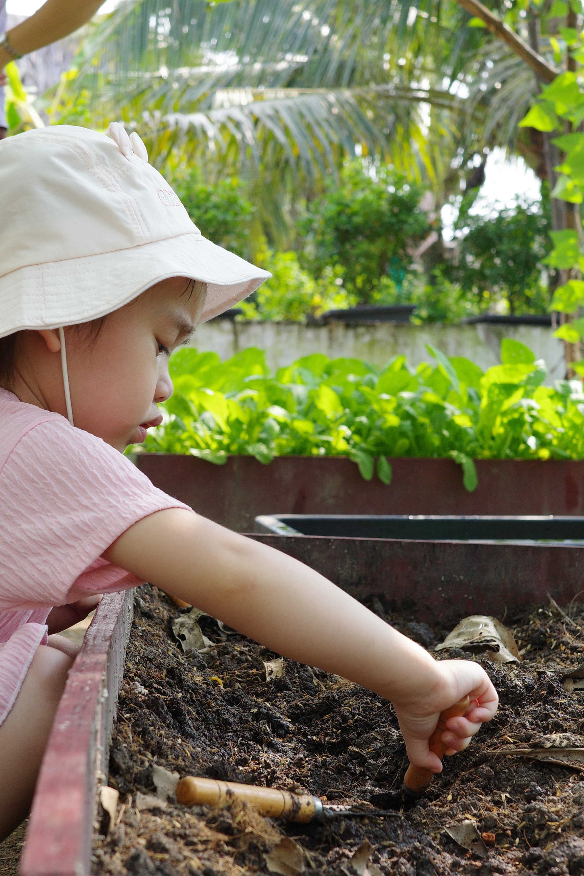 Các bé và gia đình cùng trồng cây, thu hoạch rau và học về thiên nhiên.